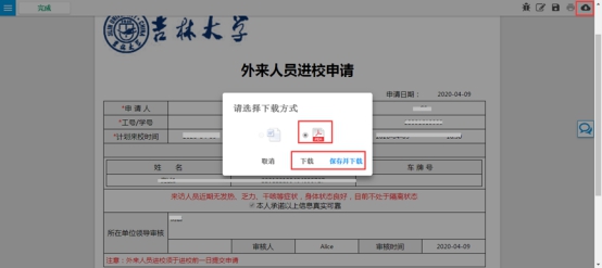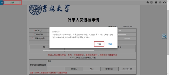 申请人确认时可在右上角下载《永利yl23411官网外来人员入校许可》 或是点击完成办理后时直接下载,如下图所示: