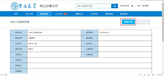 在教工服务中,找到”校外人员入校申请” 点击发起,如下图所示:
